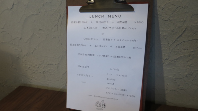前菜+パスタ+飲み物の2,000円のコースと、前菜+メイン+飲み物の2,500円のコースです。