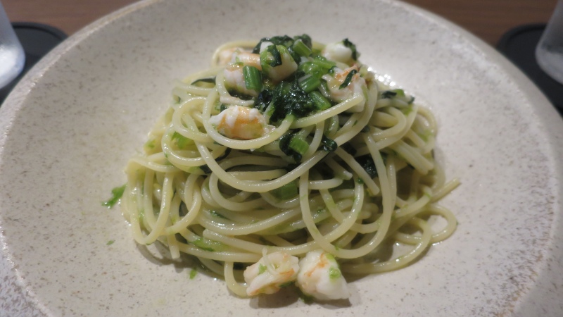 本日のパスタは、「海老と生ノリと小松菜のスパゲッティ」です。