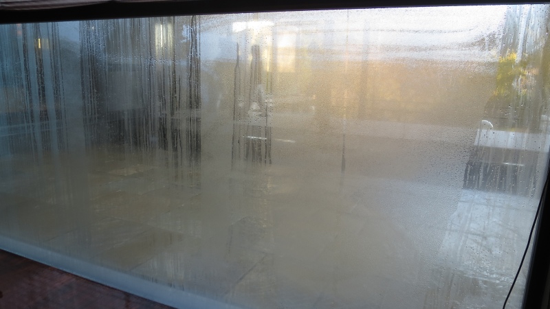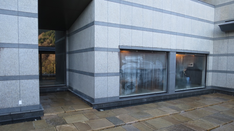 お部屋の中から見たところです。窓がちょっと曇っていました。エントランスに向かう人がそれとなく見えます。