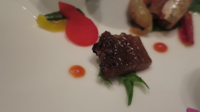 黒毛和牛のローストです。山芋に、赤ピーマンのピュレだそうです。