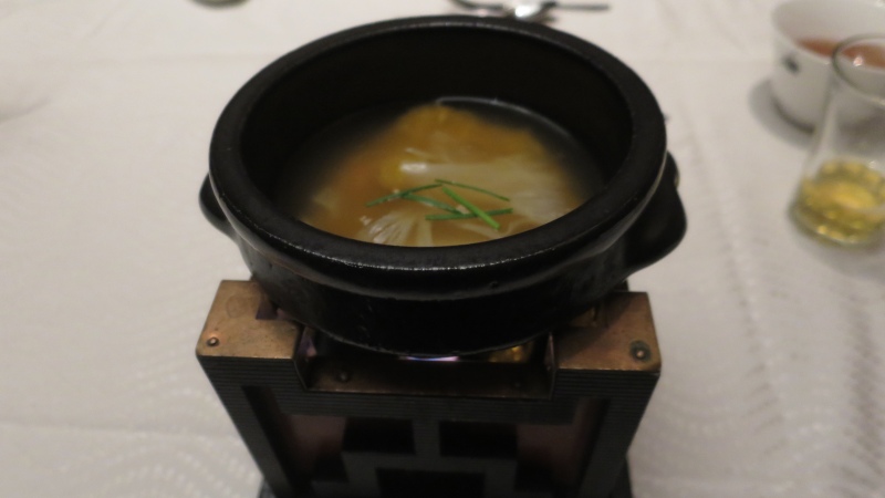 昆布だしがあっさりしている一方で、上海ガニの味噌がしっかりとしています。ちょっととろみがついたスープで、熱々でいただきます。