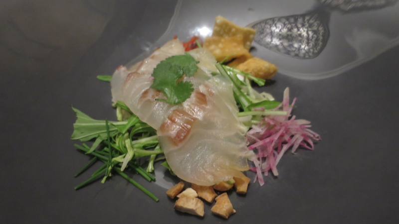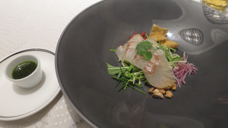 「昆布締め真鯛の中国風お造り・青葱ソース」です。