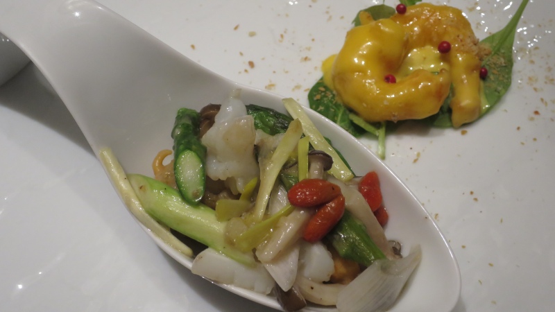 もう1つは、「海鮮二種と季節野菜の炒めもの・海老のマヨネーズソース・芒果の香り」です。