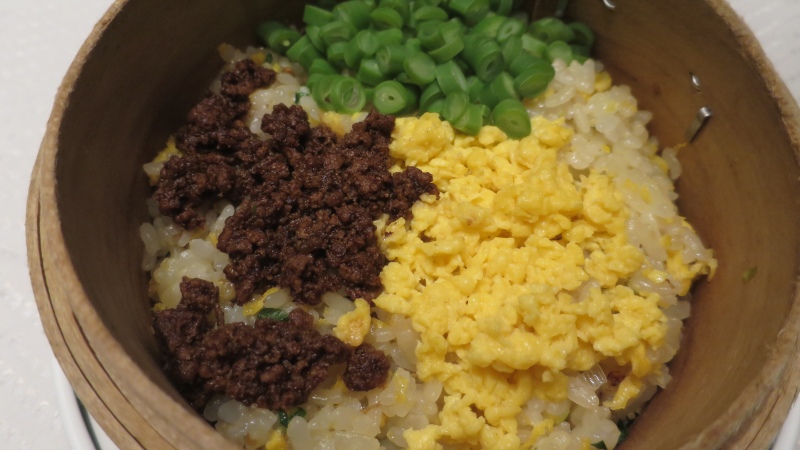 もう1つは、「豚そぼろ・いんげん・卵入り三色チャーハン・蒸籠仕立て」です。