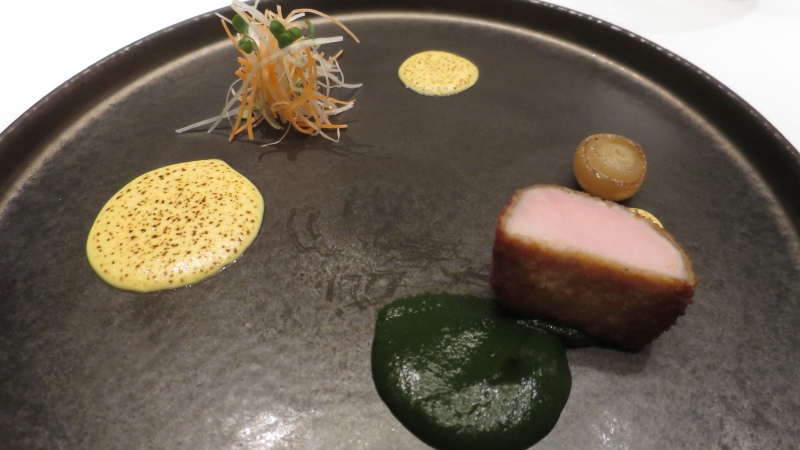 「オリーブ豚ロース肉のパネ 修善寺醤油のオランデーズソース」。
