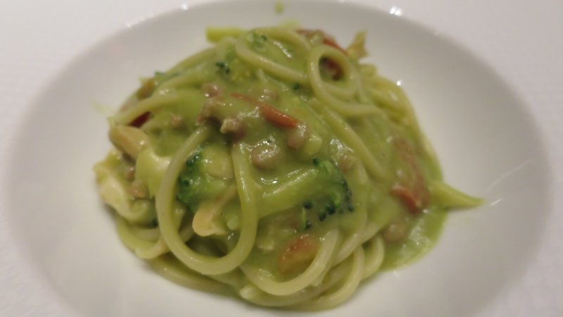 「福井県産白バイ貝と三島ブロッコリーのスパゲティーニ」。