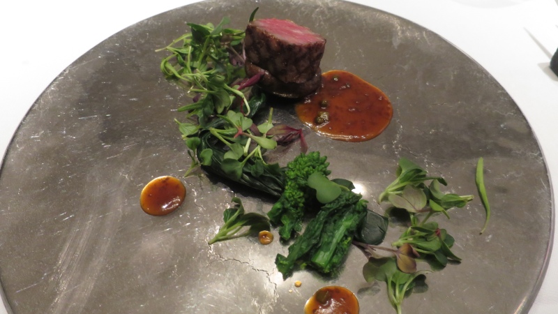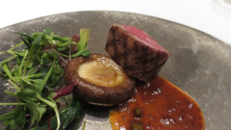 「黒毛和牛ロース肉の網焼き ソースコルニッション」。