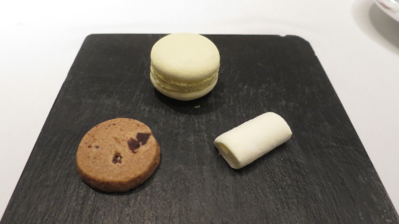 小菓子です。ピスタチオのマカロン、チョコクッキーにゆずのメレンゲでした。