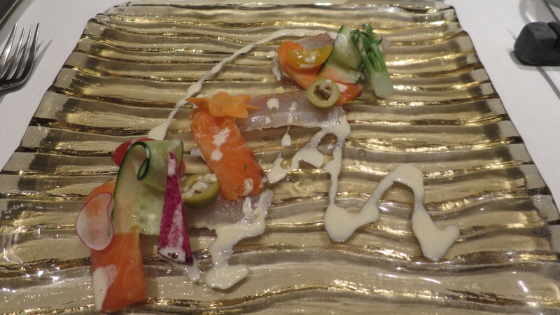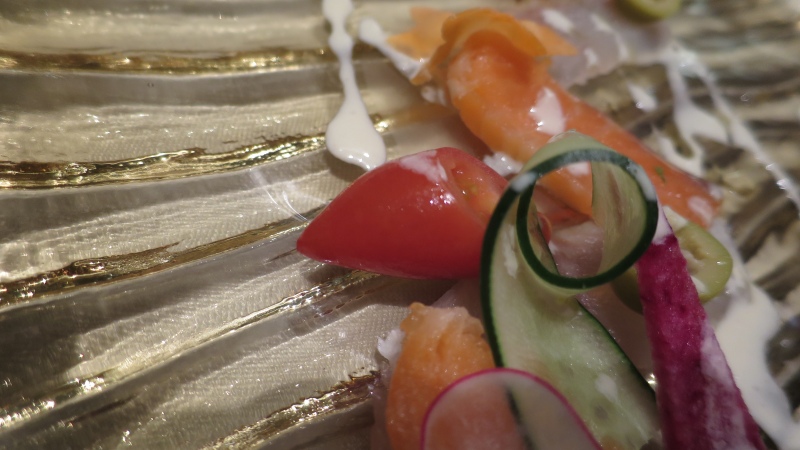 前菜は、「富士山サーモンと雪鱒のマリネ 彩り野菜と共に」です。