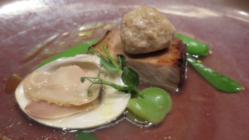 帆立と蛤のコキヤージュソース、手前はにんじんのピュレだそうです。