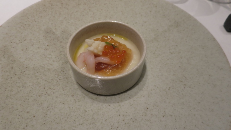 コンソメのソースとカリフラワーのムースの2種類。一緒でも別々でも美味しくて、味変が楽しめました。帆立の香りが濃厚で、新鮮な甘エビとイクラが乗っていて、美味しかったです。