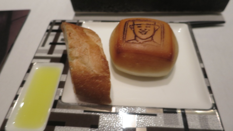 パンです。シェフの顔のパンが先に出てきます。ちょっと甘いパンです。