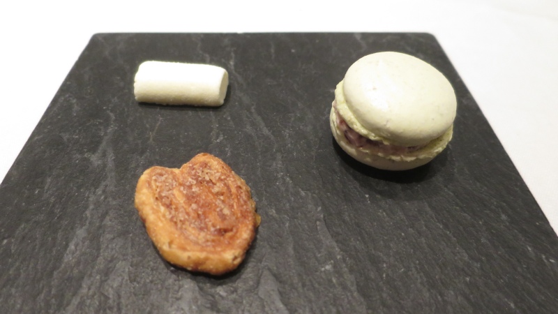 小菓子は、ピスタチオのマカロン、パッションフルーツのギモーブに、小さなパイです。