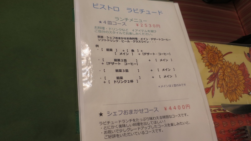 ランチのメニューは、「4皿コース」2,530円と、「シェフお任せコース」4,400円があります。