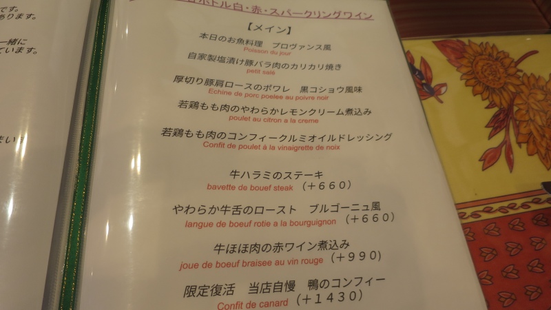 この4皿コース、前菜、メイン、デザート(飲み物付き)、飲み物から、好きな4アイテムを選ぶことができます。メインは1品、飲み物は770円までのものの範囲で選べます。また、一部のメニューは、追加料金が必要になります。また、メインとは別に、魚料理があるとのことです(メイン1品制限の枠外)。