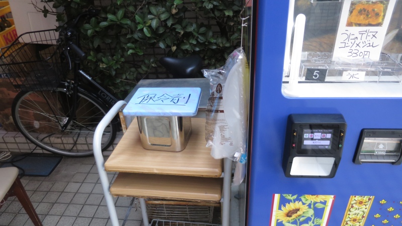 暑い中持ち帰るのが大丈夫かな、と思うのですが、なんと、自動販売機の脇には、保冷剤が置かれていました。なかなかですね。