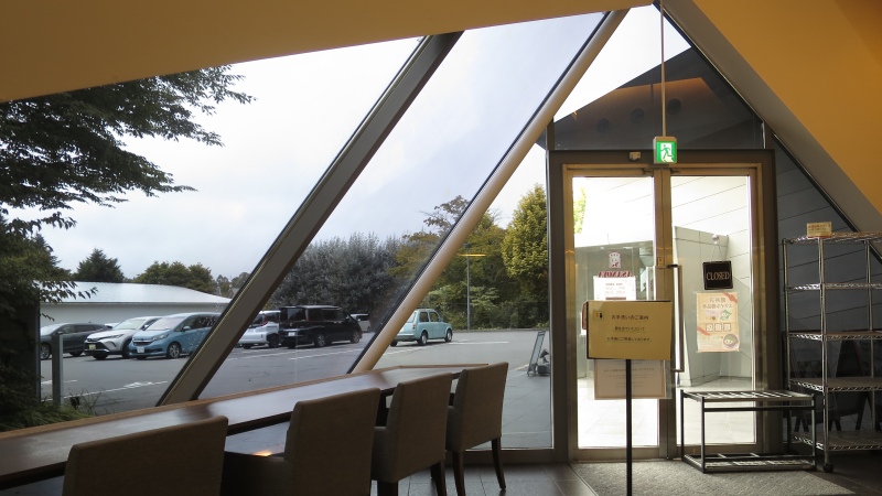 イートインスペースに座って外を見ると、こんな感じです。駐車場ビューですね。