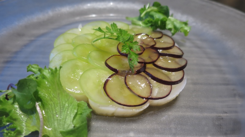 帆立の上に、ぶどう。シャインマスカットと長野パープルという二種類・二色のぶどうが、本当に薄くスライスされて、乗せられています。帆立と一緒にいただくと爽やかで、凄く美味しかったです。