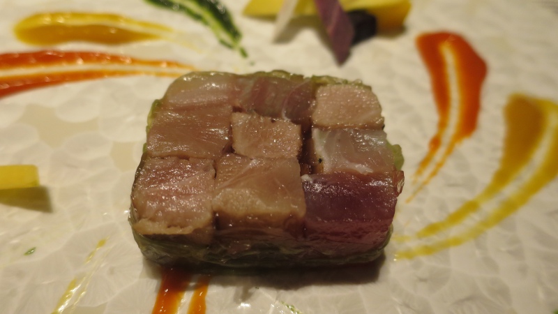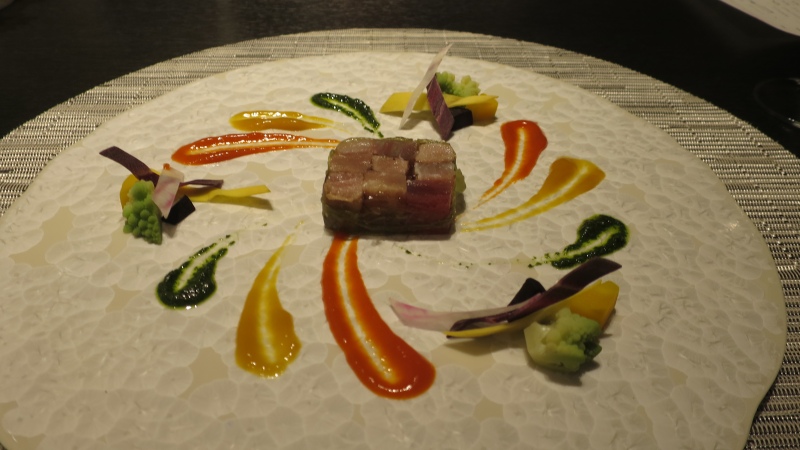 オードブルは、「レタスの宝石箱に包まれたマグロのモザイク 色彩のハーモニー」です。