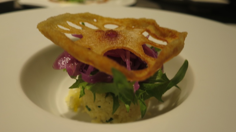 一番下にクスクス、その上に酸味のある紫キャベツ、一番上にパリッとした蓮根が乗っています。