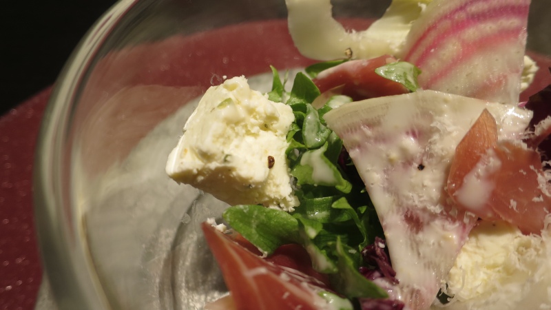 綺麗な透明の器に入ったちょっと変わったシーザーサラダ。生ハムが乗っています。