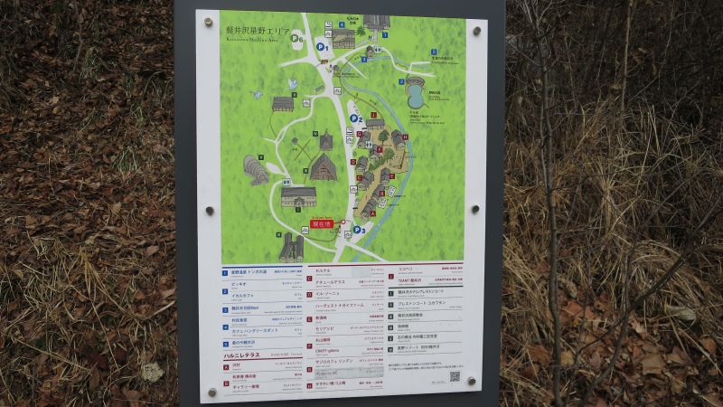 さて、星野エリアの地図です。道の右側がハルニレテラスなど、左側がホテルブレストンコートや石の教会、軽井沢高原教会です。地図にあるとおり、左側のエリアには、下の方からも、上の方からも行くことができます。
