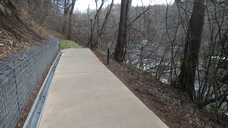 下の道から上がっていくことにしました。バス停を下りて、すぐのところにある歩道を進みます。