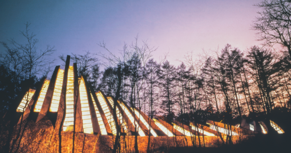 フランク・ロイド・ライトを師と仰ぐケンドリック・ケロッグは、この土地の個性を感じ取り、彼の思想をオーガニック建築で表現しました。堅固な石のアーチ、その間から光が差して緑が茂り、水が流れるこの教会は、自然との対話の中から生まれた唯一無二の祈りの空間です。