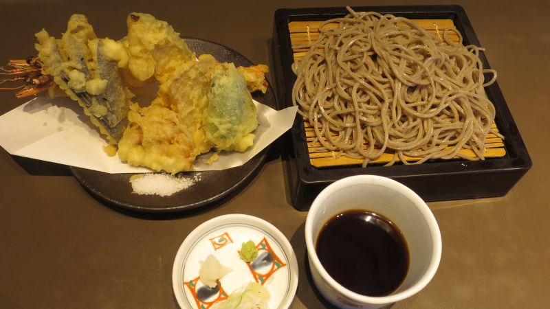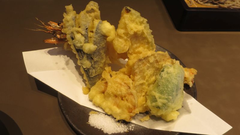 こちらが天ぷらです。エビのほか、野菜やサツマイモ、キノコもあって、それぞれ美味しかったです。量的にも十分でした。