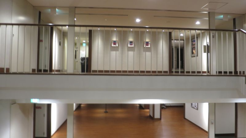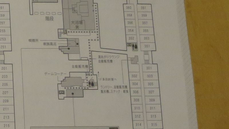 写真は、本館正面の階段の一番奥からエントランスの方を振り返ってみたところです。下の階が2階。左右に客室があります。まっすぐ行った先の階段をさらに降りていくと、ロビーやエントランスです。上の階が3階。やはり左右に客室があります。正面右側を進んでいった先が大浴場、正面左側の扉がランドリーのあるスペースです。