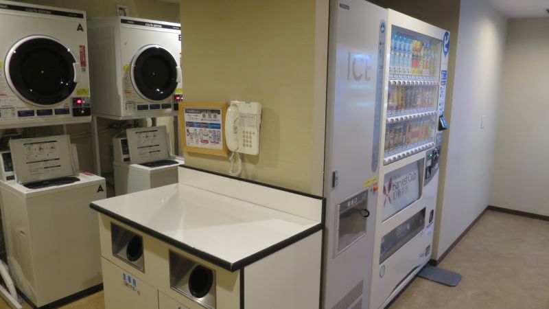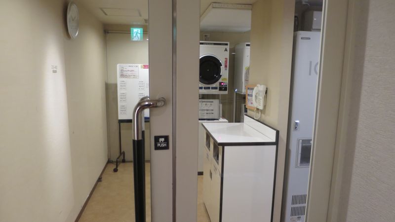 入口の扉の向こう、奥に洗濯機・乾燥機が見えます。手前には製氷機が見えますが、その先に自動販売機があります。