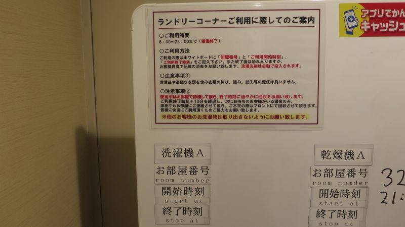 一番奥の壁に利用の注意が掲示されています。利用時間は、8時~23時です。