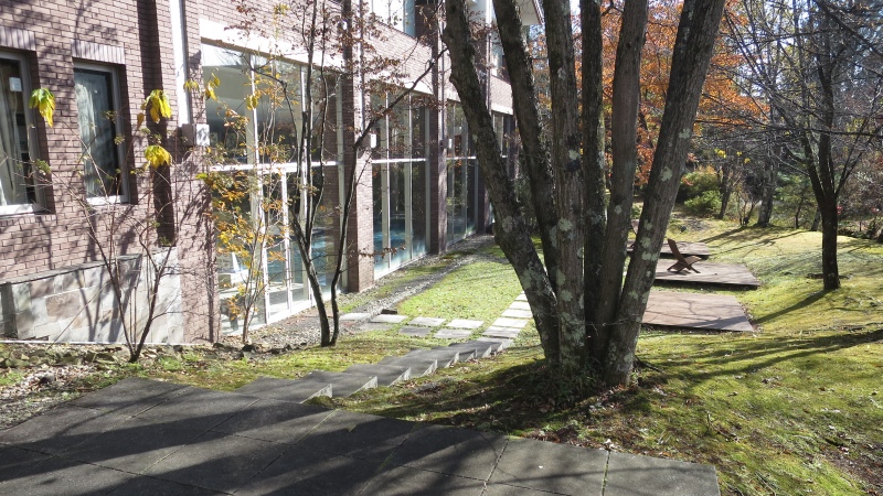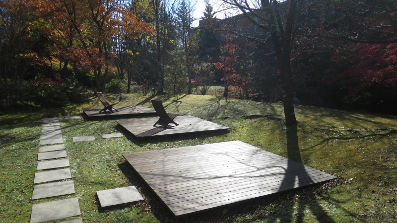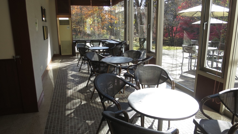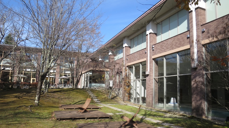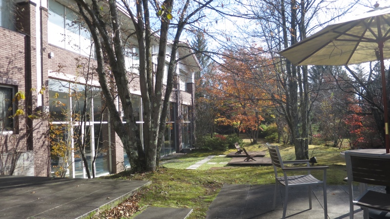 東急ハーヴェストクラブ旧軽井沢のセルフラウンジとその先のテラスについて、簡単ですが、ご紹介します。〔25年11月訪問〕