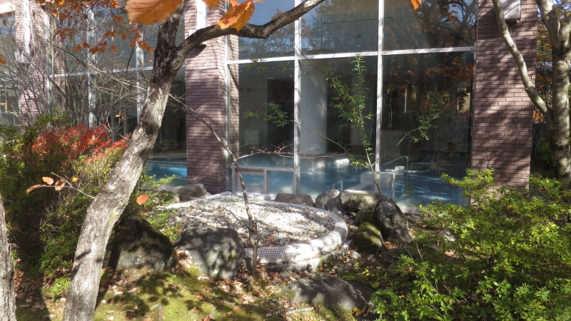 右側のプールの入った建物の上は、大浴場へ向かう廊下です。