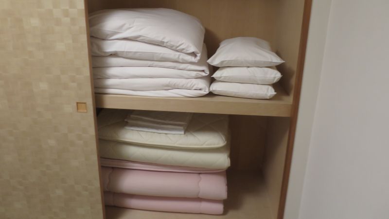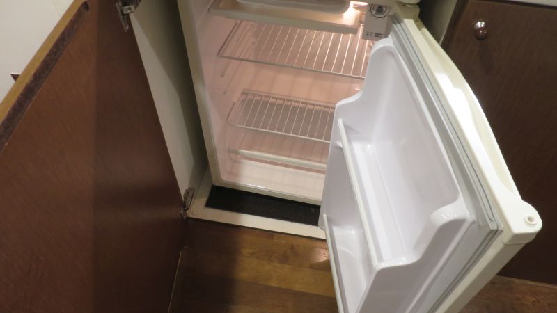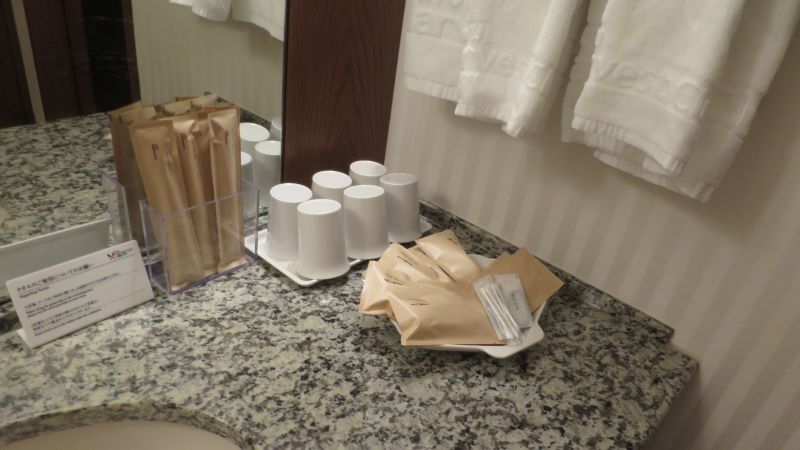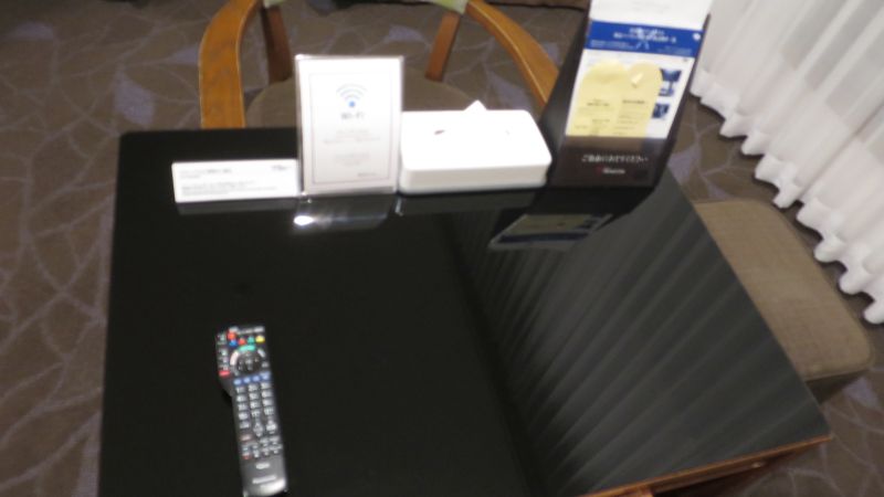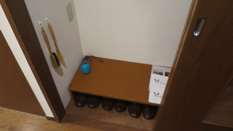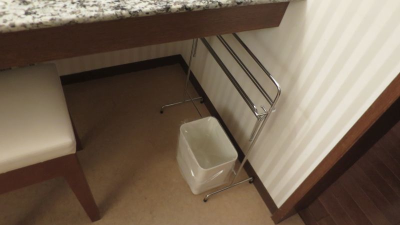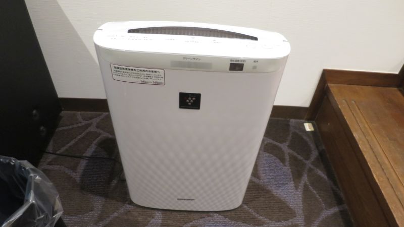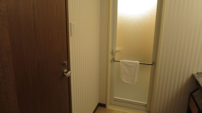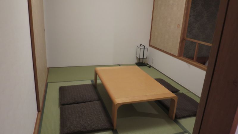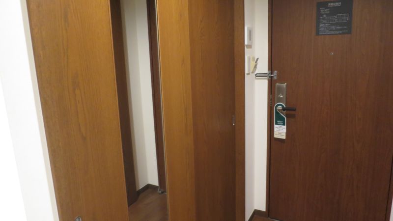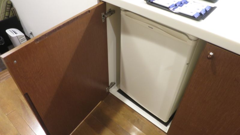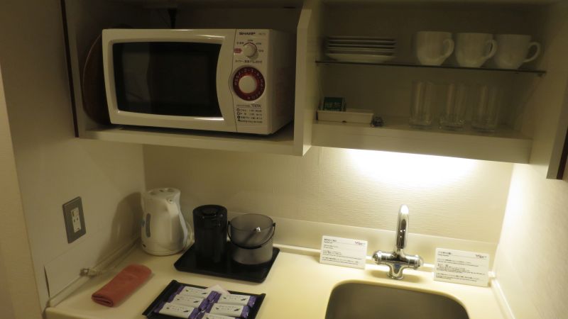 上のお部屋のお向かい、廊下沿いに、ポット等のスペースがあります。電子レンジもあって、お部屋でお食事などをする場合には、便利です。