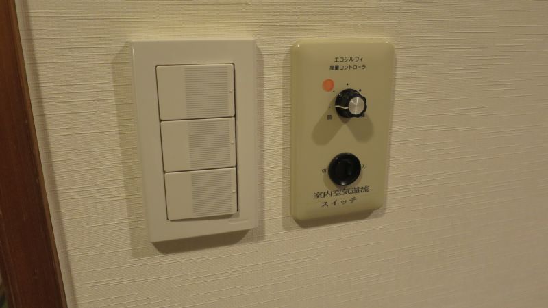 階段の手前、和室の入口に、ファンのスイッチがあります(右側)。冬は、これを回さないと、下のお部屋は寒くてたまりません。