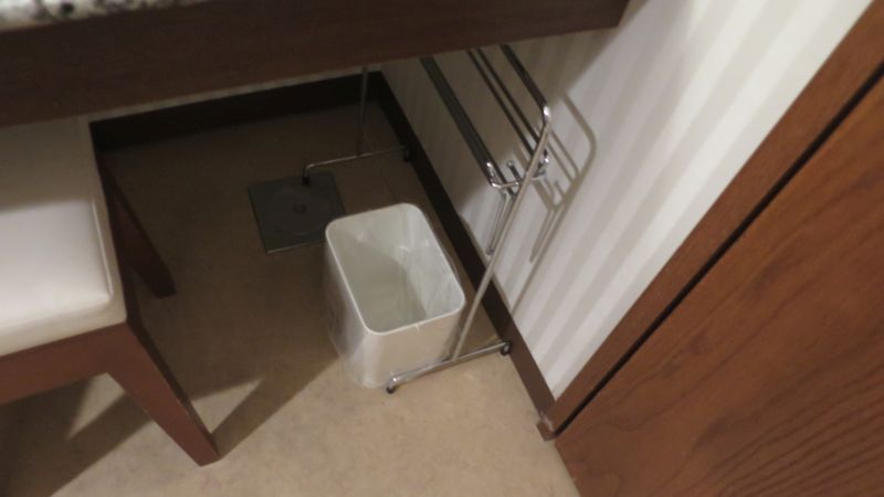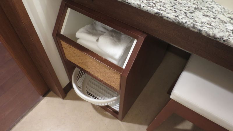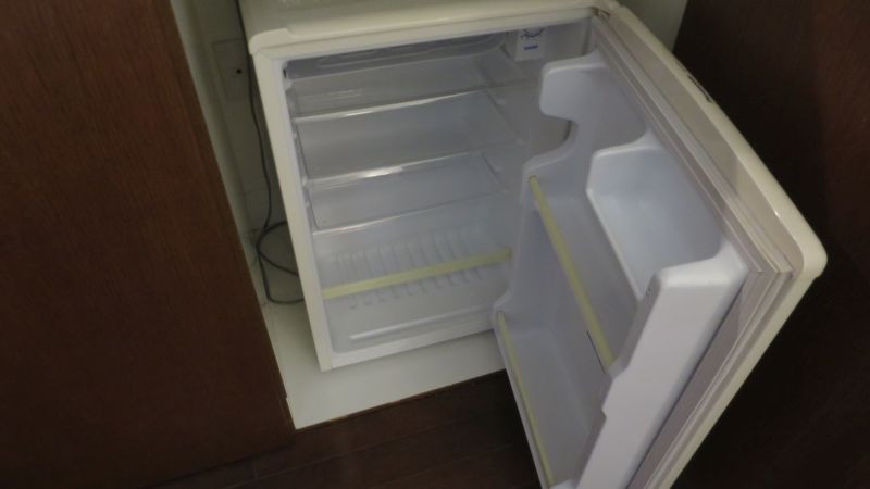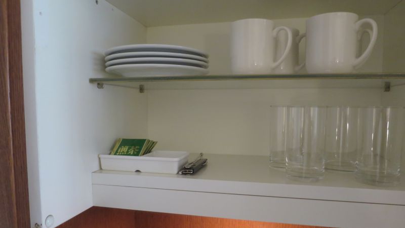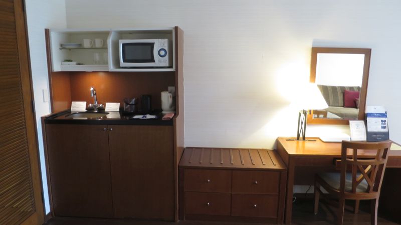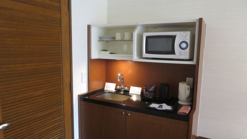 ポットの乗った棚は、水栓もあって、便利です。上に電子レンジとお皿があります。以前は、電子レンジとお皿のスペースを隠す扉があったのですが、なくなってしまったようです。常に電子レンジなどが露出しているのも微妙です。