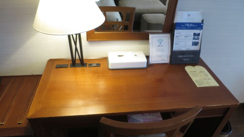 ベッドの向かい側に、デスクとチェア、荷物置きの棚、そして、ポット等の乗った台があります。