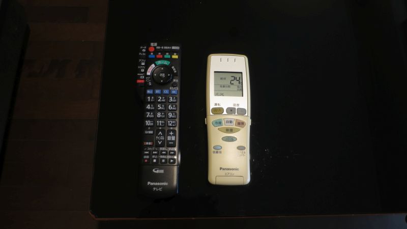 ソファースペースのテーブルの上に、テレビのリモコンと空調のリモコン。