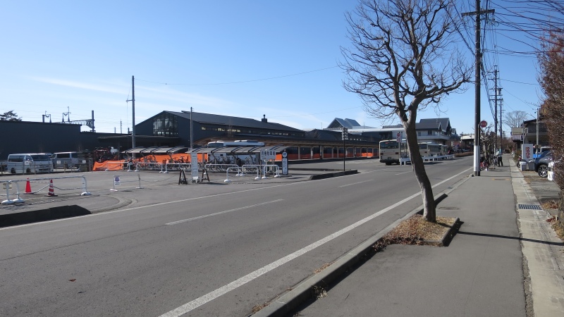 軽井沢駅北口の駅前。エスカレータを降りたところ、バス停の裏側に囲いができて、工事が続いていました。こちらは、2025年5月の状況です。