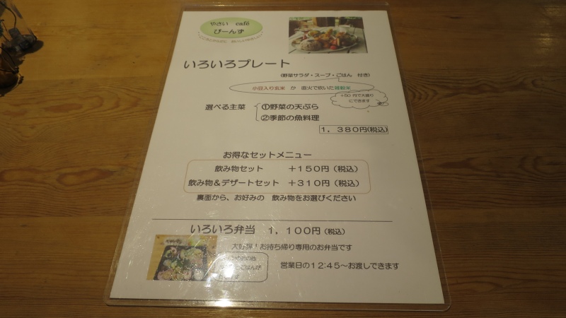 ランチのメニューです。「いろいろプレート」。主菜が選べます。「野菜の天ぷら」か「季節の魚料理」です。