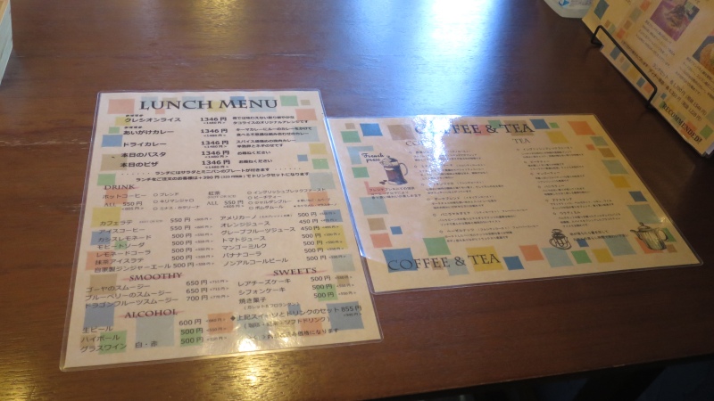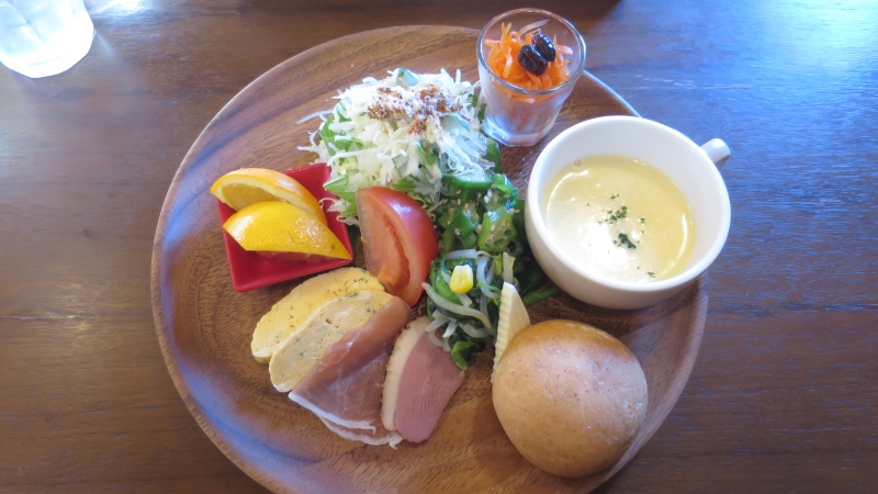 天井が高く、テーブルの間隔も広くて、ゆったりとしたゆとりの空間。陽も差し込んで、森の中の別荘にきたような感じです。