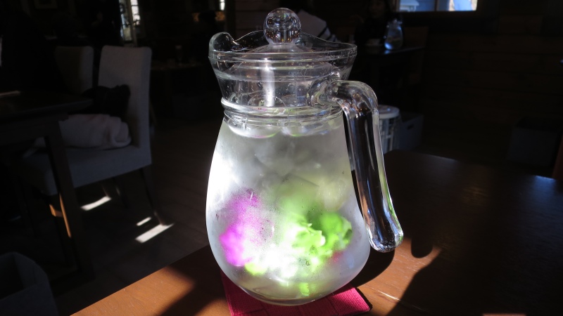 お水です。中に、カラフルなレモンやサラダ菜、紫キャベツが入っていて、綺麗です。