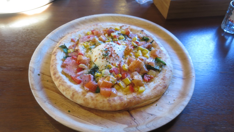 半熟たまご、サラミ、パプリカ、コーン。いろいろなものが乗っています。いろいろな味が楽しめて、チーズもたくさん乗っていて、贅沢で、楽しいピザです。