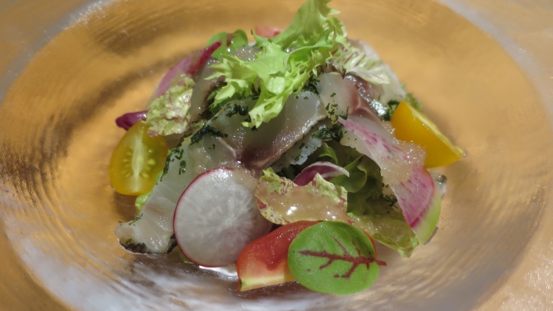 前菜は、「イサキのマリネとタプナードのサラダ仕立て」です。