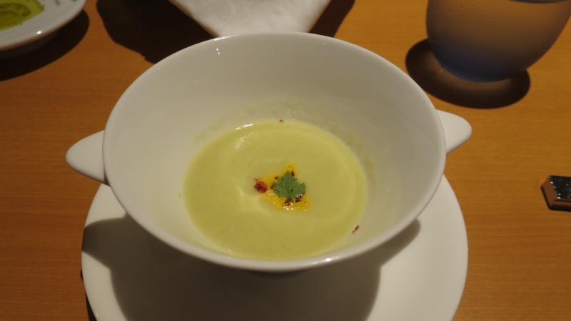 スープは、「アスパラガスのポタージュ オランデーズソース添え」です。