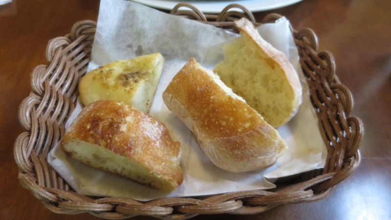 周りを見ていたら、ランチの自家製パンは、組合せがいろいろなようです。お隣のテーブルでは、なんと、食パンが半分ずつ出てきていました