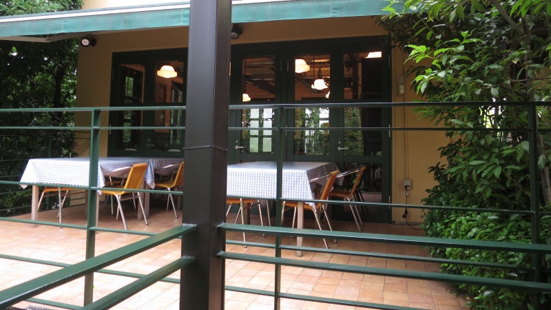 表通りから一方通行の少し細い通りに入ったところです。開放的な感じで、道からそのまま入れます。周りには、木が植えられていて、雰囲気があります。