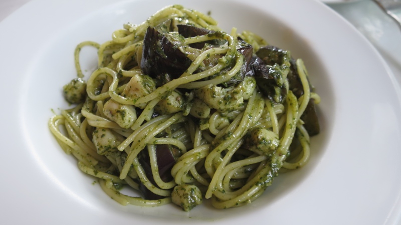 「小柱・焼きナス ジェノベーゼソース」のスパゲティです。