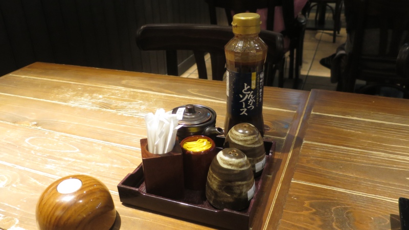 テーブルの上にあるソースその他のセットです。